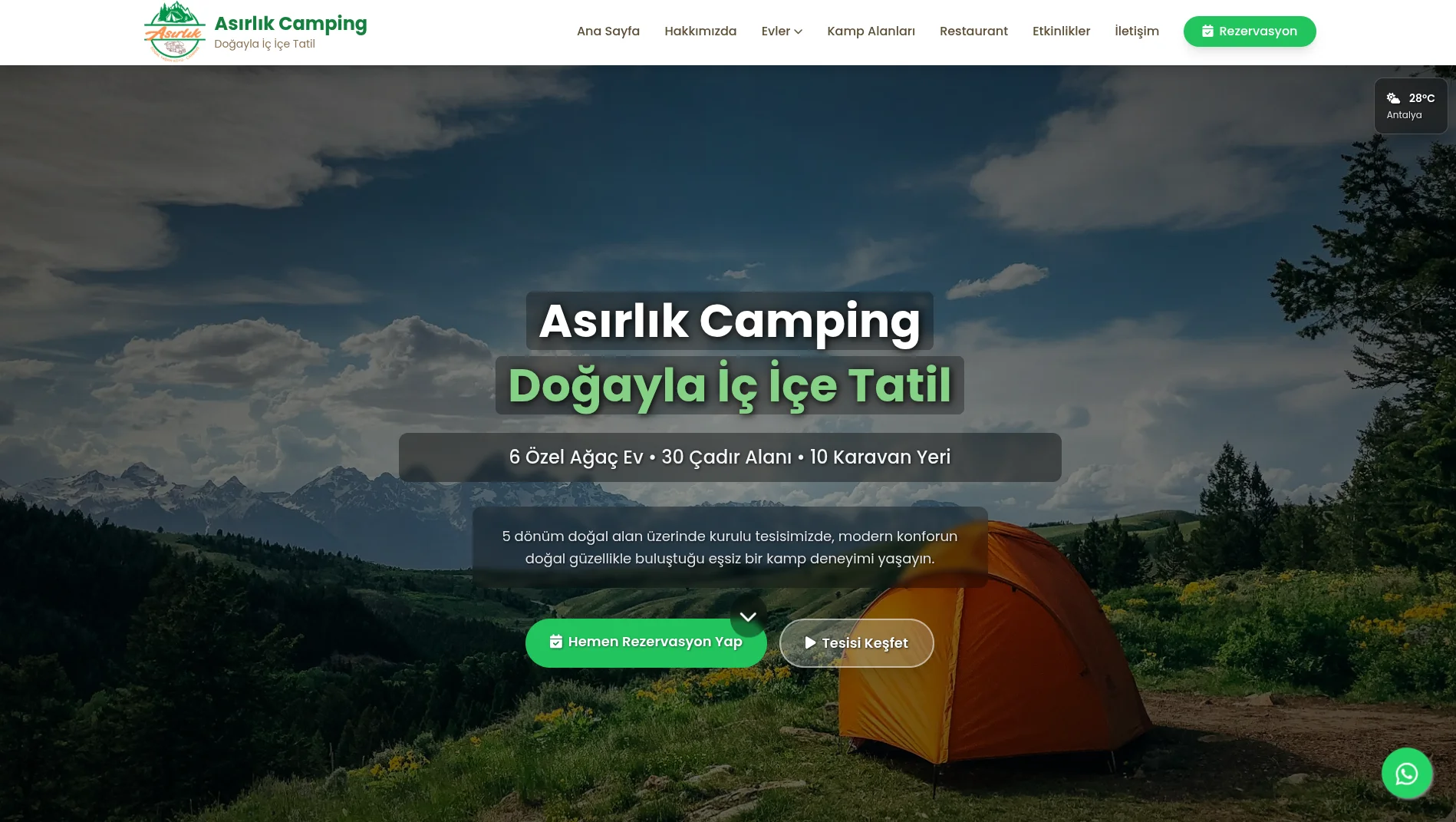 Ağaç evler, restaurant ve etkinlik alanları için profesyonel tanıtım sitesi. Online rezervasyon talep formu.